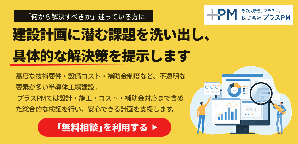 プラスPMは、半導体製造・関連の工場の新設・拡張における施主様の負担を軽減し、最適な結果を実現するプロフェッショナルです。